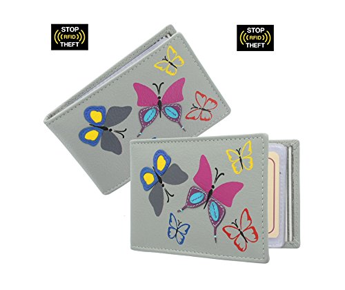 - Soft supple leather card holder with applique butterfly design 10.5cm x 7cm x 1cm. RFID or Radio-Frequency Identification involves the use of microchips which contain sensitive financial and personal data. This holder features RFID blocking technology which prevents unauthorised access to the data contained on contactless debit/credit cards whilst these cards are contained in the closed purse